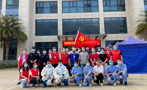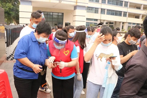 從早上8點(diǎn)半起,周邊企業(yè)的員工們就分批來(lái)到等待區(qū)域?!罢?qǐng)往這里走?!薄奥闊┏鍪疽幌滦谐檀a?!币荒ò咨c紅色交織的身影,正在進(jìn)行現(xiàn)場(chǎng)分流引導(dǎo)、幫忙查詢(xún)行程,他們正是由邁銳光電黨支部黨員和入黨積極分子組成的7人志愿者隊(duì)伍。在他們的助力下,現(xiàn)場(chǎng)每個(gè)步驟環(huán)環(huán)相扣、有條不紊,在當(dāng)日16時(shí)即完成全部6500余人的核酸檢測(cè)工作,讓黨旗在防疫一線(xiàn)高高飄揚(yáng)。