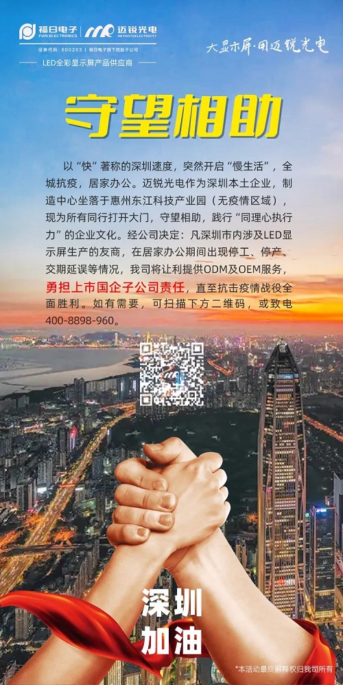 因?yàn)橐咔椋?/span>“快”著稱(chēng)的深圳速度,也突然開(kāi)啟“慢”生活。3月15日,邁銳光電發(fā)布信息,表示該公司制造中心坐落在無(wú)疫情區(qū)域的惠州東江科技產(chǎn)業(yè)園,如深州市內(nèi)涉及LED顯示屏生產(chǎn)的友商,在居家辦公期間出現(xiàn)停工、停產(chǎn)、交期延誤等情況,該公司將讓利提供ODM及OEM服務(wù),直至抗擊疫情戰(zhàn)役全面勝利,充分展現(xiàn)其“同理心執(zhí)行力”的企業(yè)文化和“守望相助”的使命責(zé)任。