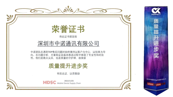 近日,2022年聯(lián)想供應(yīng)商質(zhì)量論壇主題分享及年度頒獎(jiǎng)在線(xiàn)上拉開(kāi)帷幕,福日電子成員企業(yè)深圳市中諾通訊有限公司在線(xiàn)上出席了此次活動(dòng)?!敖臣壹甲钋?,能工事尤精”,今年中諾項(xiàng)目的售后返修率TCRR指標(biāo)滿(mǎn)足目標(biāo)要求并持續(xù)降低,在本次論壇中獲得多次表?yè)P(yáng),并榮獲“聯(lián)想2022年度質(zhì)量提升進(jìn)步獎(jiǎng)”。