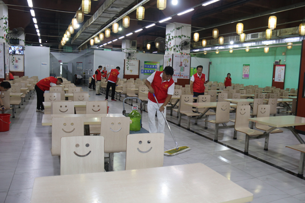 首先進行的是公司食堂的清掃清潔。只見志愿者們有的手持抹布,有的揮舞拖把,有的幫忙換水,大家團結(jié)協(xié)作分工有序埋頭苦干,對食堂的打菜窗口、桌椅板凳、地面墻角等處進行深入清掃,做到不留衛(wèi)生死角。通過辛勤勞動,食堂的環(huán)境衛(wèi)生狀況得到改善,面貌煥然一新。