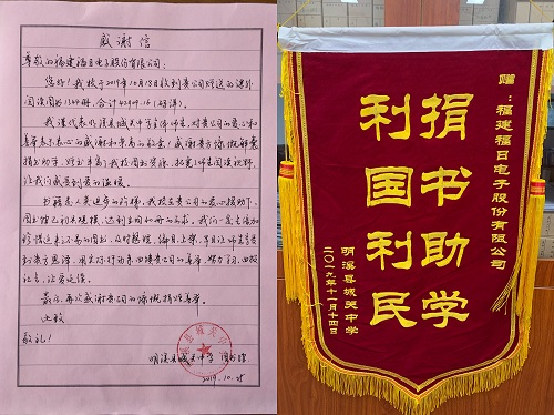 明溪縣城關(guān)中學寄來的感謝信和錦旗
