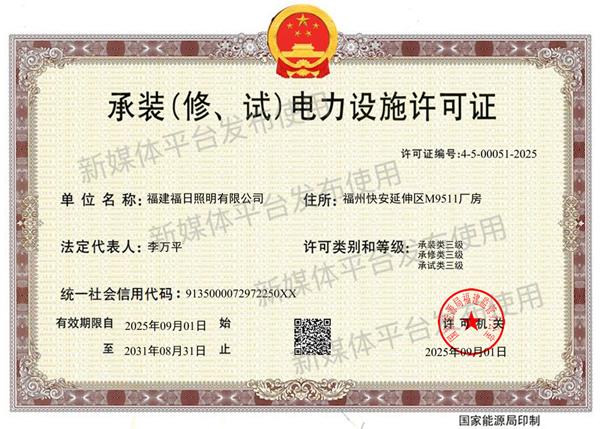 近日,福日電子成員企業(yè)福日照明順利通過(guò)國(guó)家能源局福建監(jiān)管辦公室核準(zhǔn),成功取得承裝(修、試)電力設(shè)施許可證(三級(jí))資質(zhì)。這標(biāo)志著福日照明已具備承接35kV及以下電壓等級(jí)電力設(shè)施的安裝、維修和試驗(yàn)業(yè)務(wù)的全面能力,為企業(yè)進(jìn)一步拓展電力工程市場(chǎng)提供了堅(jiān)實(shí)保障。